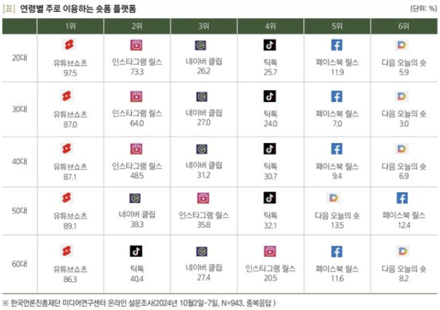 숏폼, 20대부터 60대까지 전 연령이 시청하는 매체로 자리잡다